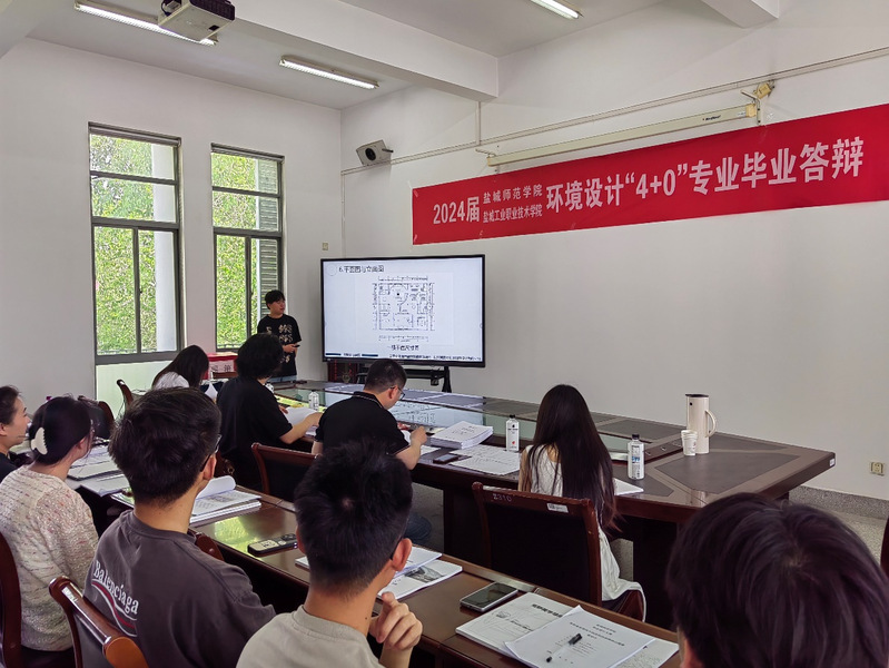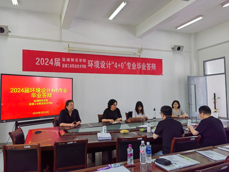 2024年5月18日,艺术设计学院举办2024届环境设计专业“4+0”本科班毕业答辩。盐城师范学院美术与设计学院院长王忠林、叶军教授、姜江老师、尹小亭老师,学院党总支书记秦晓、副院长方美清、环境艺术设计教研室主任孙直法参加了此次答辩会。