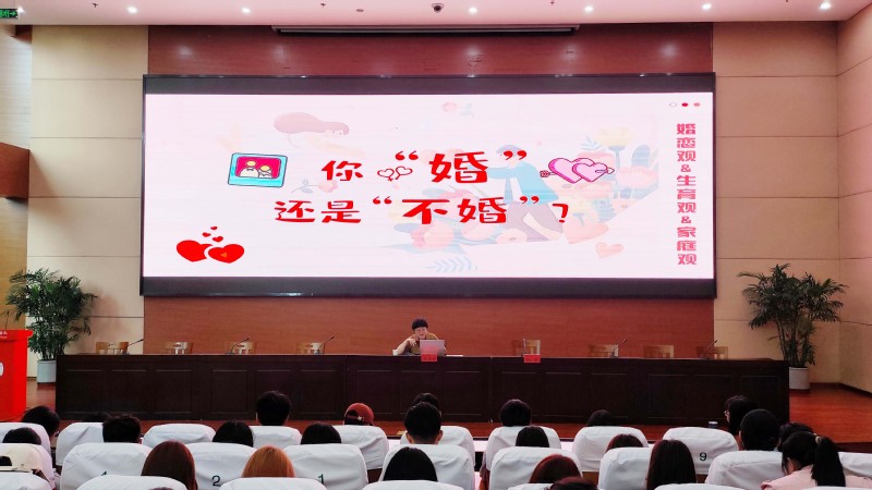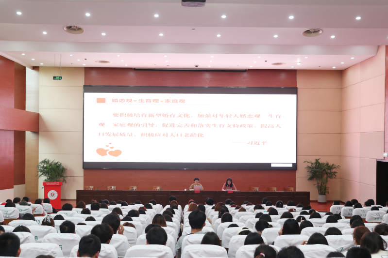 李健明以“我校的学生婚育观”调查问卷的数据为切入点,对学生的结婚意愿、生育意愿、婚姻维系、社会保障等相关观点进行分析,引导学生以积极的态度探索属于自己的婚育模式。她对传统型婚育观、复古型婚育观、断裂型婚育观三种不同的观念进行了介绍,对婚姻对于个体层面及人类社会层面的积极影响作了详细阐释。