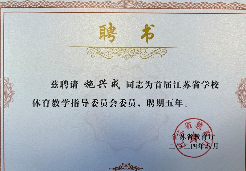 近日,江苏省教育厅发布了《关于成立首届江苏省学校体育教学指导委员会的通知》,学校体育学院院长施兴成当选首届江苏省学校体育教学指导委员会委员。