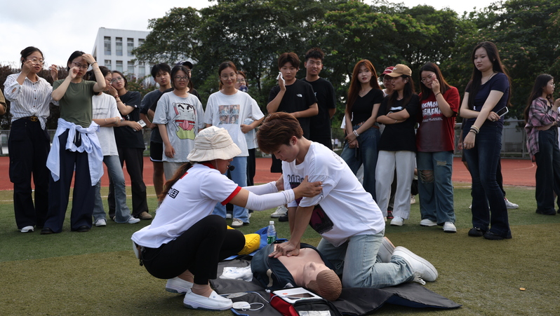 荣中祥通过生动的讲解和操作演示,向新生们传授了应急救护的基本知识和技能。现场实操环节,培训老师们用人体模型给学生现场演示心肺复苏的完整操作流程,用专业的技术和娴熟的手法演示了成功救助的全过程,并通过分组训练让学生参与急救操作。现场气氛热烈而有序。