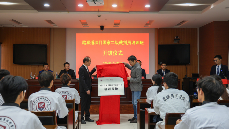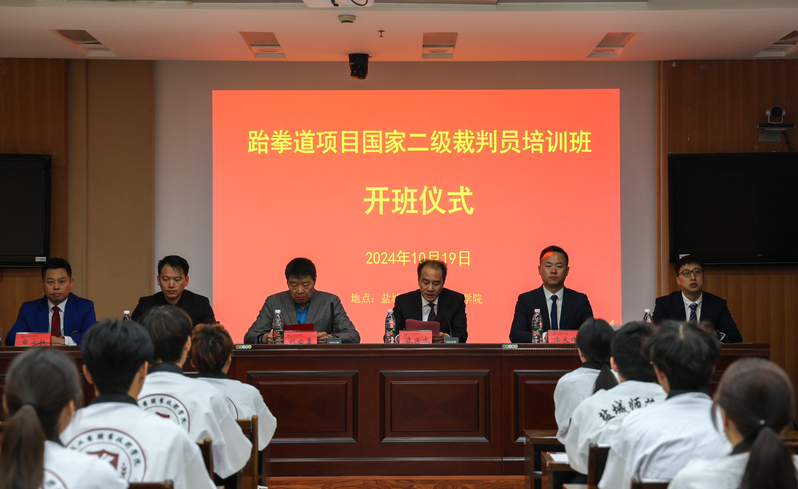 10月19日,2024年盐城市跆拳道项目国家二级裁判员培训班开班仪式暨跆拳道项目国家二级裁判员培训基地揭牌仪式在学校图文信息中心第三会议室举行。盐城市跆拳道协会秘书长、原江苏省跆拳道队主教练刘必勇出席。体育学院负责同志,盐城市跆拳道协会、体育学院相关人员和45名学员参加开班仪式。盐城市跆拳道协会副秘书长滕其壮主持仪式。
