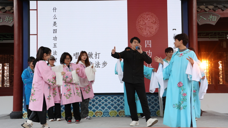 第二站,同学们走进充满浓郁文化气息的淮剧小镇,古色古香的建筑与现代艺术元素巧妙融合,展现了传统与现代的和谐共生。同学们近距离观赏地道的淮剧表演,还亲身体验了淮剧服饰穿戴、学习基本唱腔和身段,深刻感受淮剧艺术的魅力。