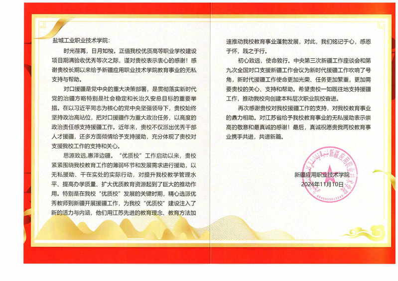信中指出,对口援疆是党中央的重大决策部署,是贯彻落实新时代党的治疆方略特别是社会稳定和长治久安总目标的重要举措。在以习近平同志为核心的党中央坚强领导下,盐城工业职业技术学院始终坚持政治高站位,把对口援疆作为重大政治任务,以高度的政治责任感支持援疆工作。近年来,学校精心选派骨干教师周欢、朱璟赴新疆应用职业技术学院对口支援与交流合作,为新疆应用职业技术学院“优质校”建设注入了新的活力与内涵,用江苏先进的教育理念、教育方法加速推动教育事业蓬勃发展。