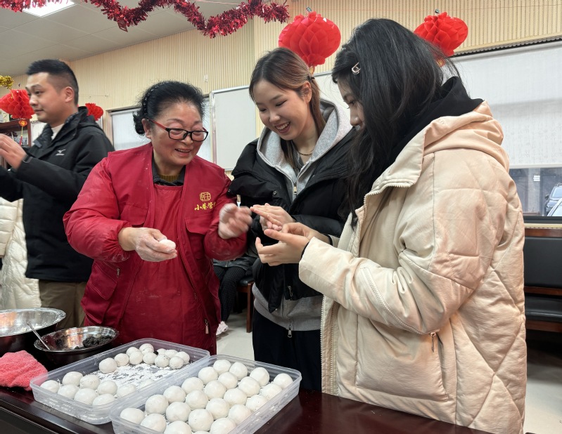 在珠溪古镇民主社区活动中心,社区居民手把手教留学生揉糯米粉、包芝麻馅汤圆。留学生还在非遗传承人指导下用环保材料制作出精美的创意灯笼。