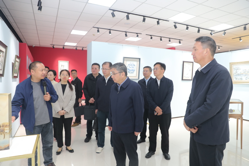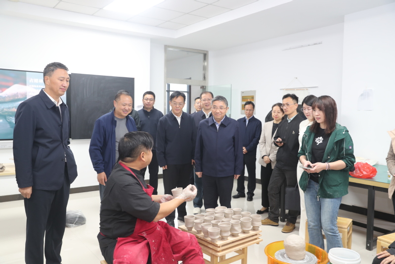 在非遗学院,江涌一行走进瓷刻、陶艺等非遗技艺传承工作室等,参观非遗作品展示,驻足观摩师生创作过程,对学校在非遗技艺传承与人才培养方面的成果表示赞赏,鼓励师生将非遗技艺深度融入专业教学,努力培养更多中华优秀传统文化的传承者和弘扬者,推动非遗文化创造性转化和创新性发展。