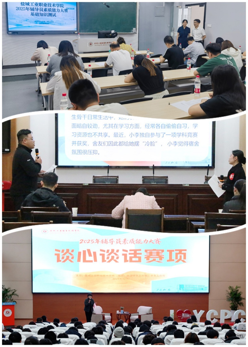 12月20日,学校2025年辅导员素质能力大赛在学术报告厅落下帷幕。本次大赛以“锤炼专业本领 赋能学生成长”为主题,设置基础知识测试、班情熟知、案例研讨、谈心谈话四个赛项,为辅导员搭建了展示专业风采、交流育人经验、提升综合能力的平台。副校长陈宏武出席大赛启动仪式,并巡视基础知识测试考场。