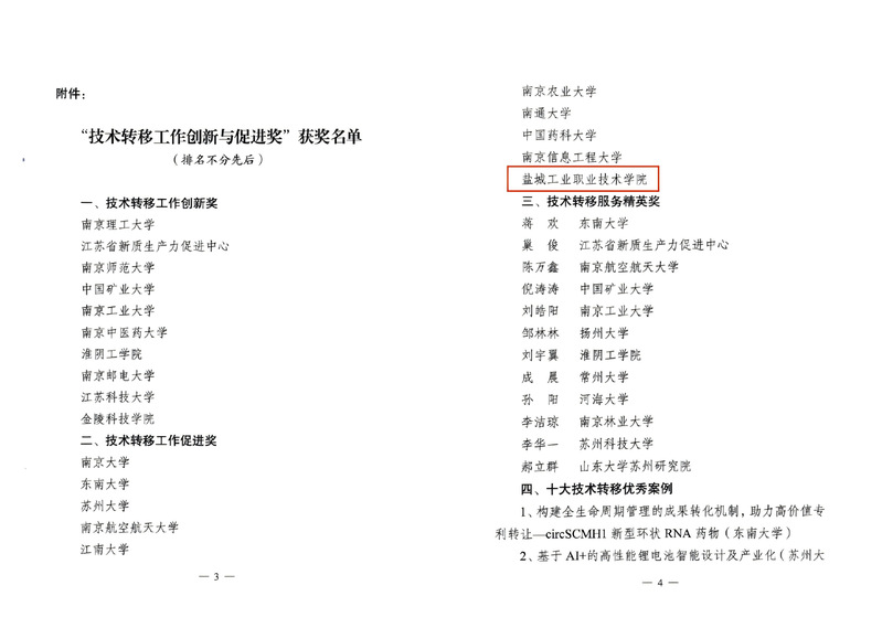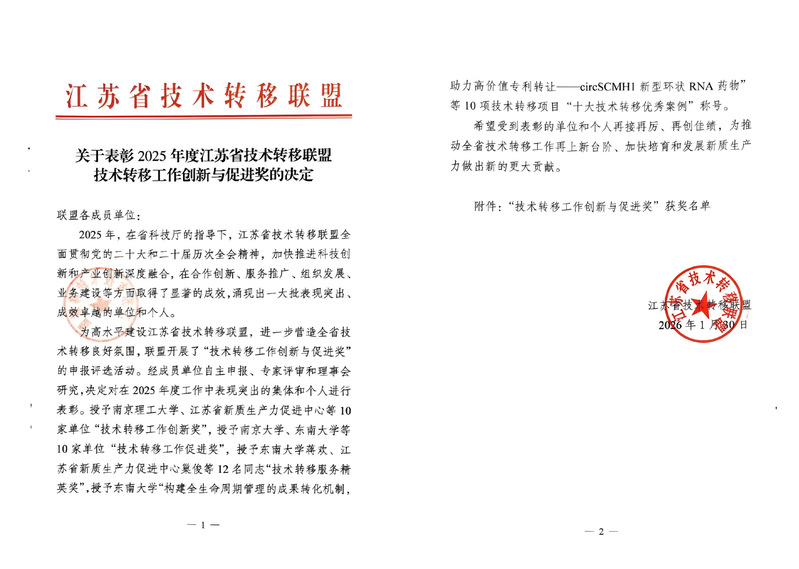 近日,江苏省技术转移联盟公布2025年度技术转移工作创新与促进奖表彰结果,学校凭借合作创新、技术转移、成果转化及服务推广等方面取得的突出成效,荣获技术转移工作促进奖。