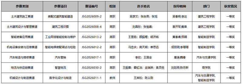 近日,由江苏省教育厅、省发展和改革委员会、省工业和信息化厅等多部门联合主办的2026年江苏省职业院校技能大赛落下帷幕。学校师生凭借扎实的专业技能、出色的实践能力和顽强的拼搏精神,在比赛中再创佳绩,共斩获一等奖7项、二等奖16项、三等奖12项,学生一等奖数量和获奖总数均创历史新高。