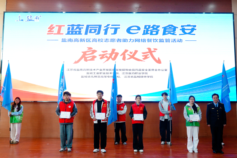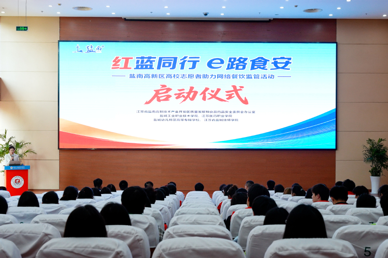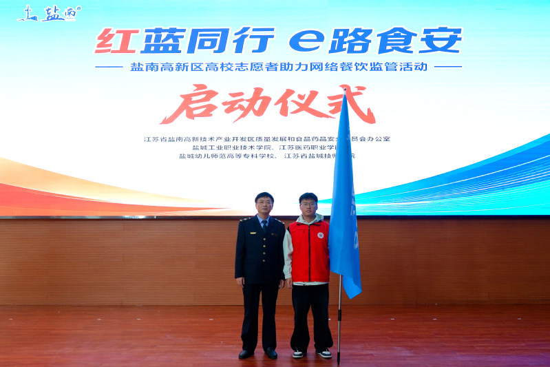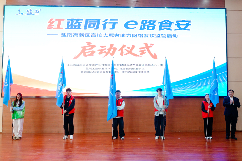 4月25日,“红蓝同行 e路食安”盐南高新区高校志愿者助力网络餐饮监管活动启动仪式在学校举行。副校长徐桂中、盐南高新区市场监管局局长高东飞、副局长徐华斌出席启动仪式。